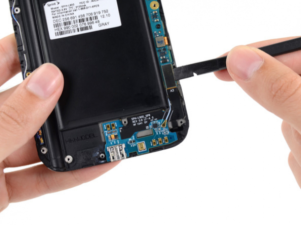 Använd ett öppningsverktyg för att lyfta upp batteriet ur höljet. Du måste sätta in verktyget i fördjupningen ovanför batterifacket för att göra detta.