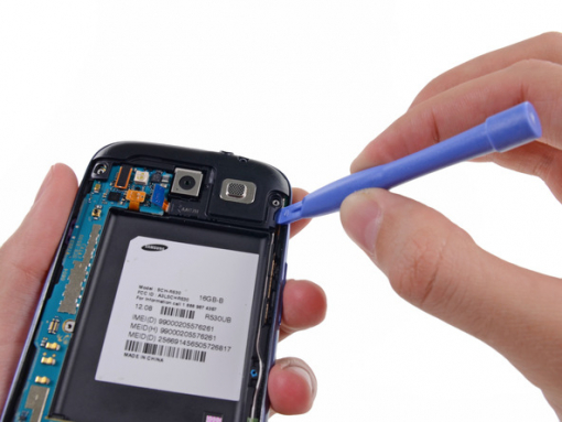 Sätt in öppningsverktyget i den lilla skåran ovanför batteriet.
