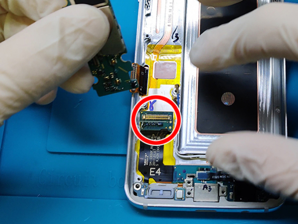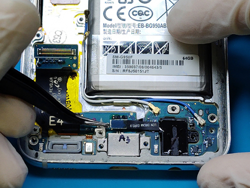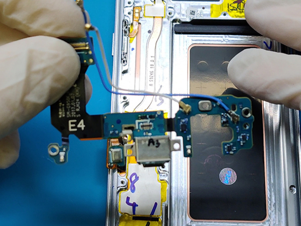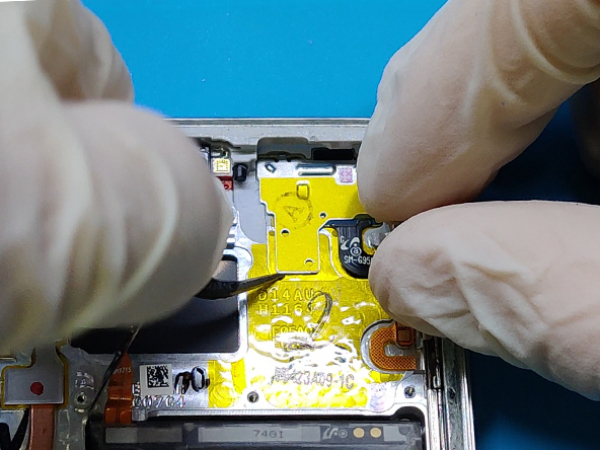 Kabeln till fingeravtryckssensorn ansluter mobilen till bakglaset nära huvudkameran. Kabeln är väldigt kort och bör tas loss när glaset tagits bort.