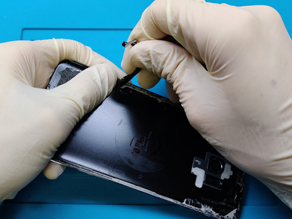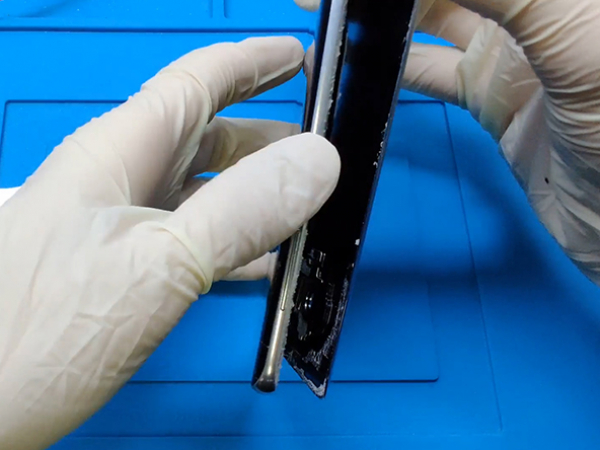 Skjut in det släta metallbladet mellan bakglaset och ramen av mobilen.