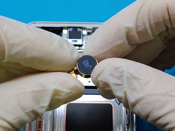 Sätt nu in den knappformade vibratormotorn i utskärningen på ovansidan av ramen.