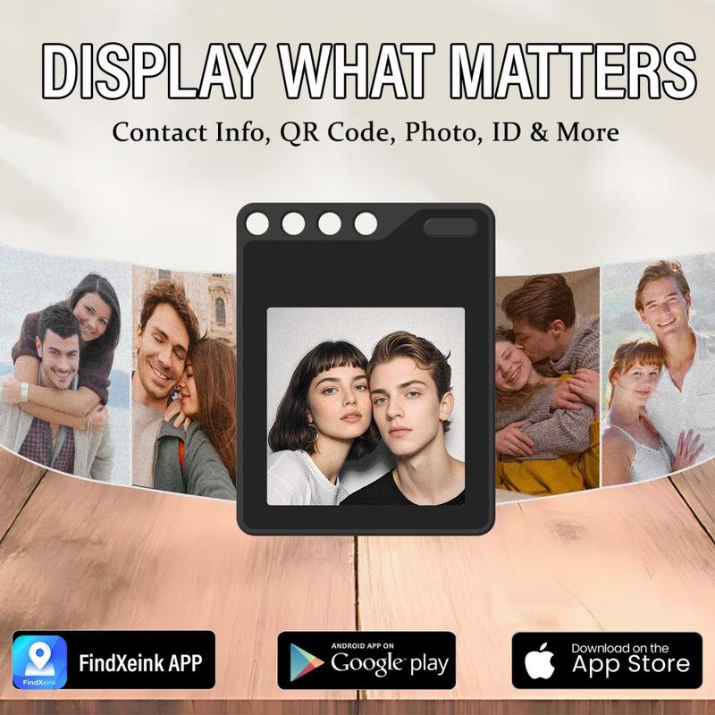 - Den anpassningsbara skärmen stöder foton, text, kontaktuppgifter och QR-koder via FindXeink-appen