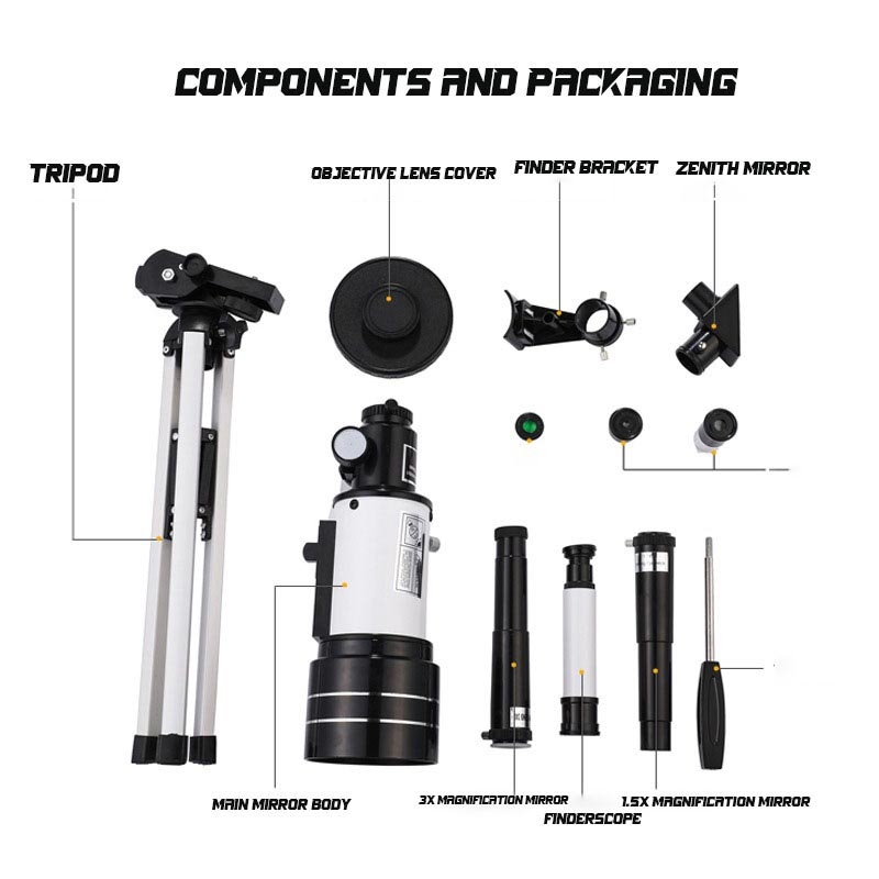 - Stabilt stativ ingår: Ger tillförlitligt stöd och stadiga bilder, vilket är avgörande för att ta telefonfoton eller helt enkelt njuta av en klar utsikt över himlen.