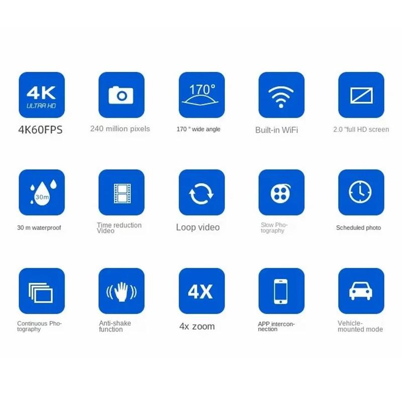 Fånga skarpa, uppslukande bilder var du än befinner dig med F300AB-R 4K-actionkameran. Den är utformad för utomhusäventyr och vardagsinspelningar och kombinerar en bred betraktningsvinkel på 170 grader, smidig höghastighetsvideo och en responsiv 2-tums HD-pekskärm. Med inbyggt WiFi och ett robust vattentätt hölje som tål upp till 30 m är den redo för resor, sport och undervattensutforskning direkt ur förpackningen.