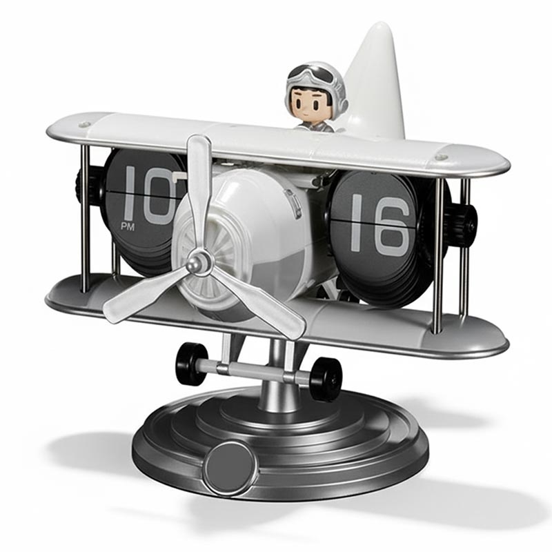 - Moderna flipklockor har ofta fantasifulla former - som det här flygplansmotivet - för att hålla den klassiska tekniken fräsch och relevant.