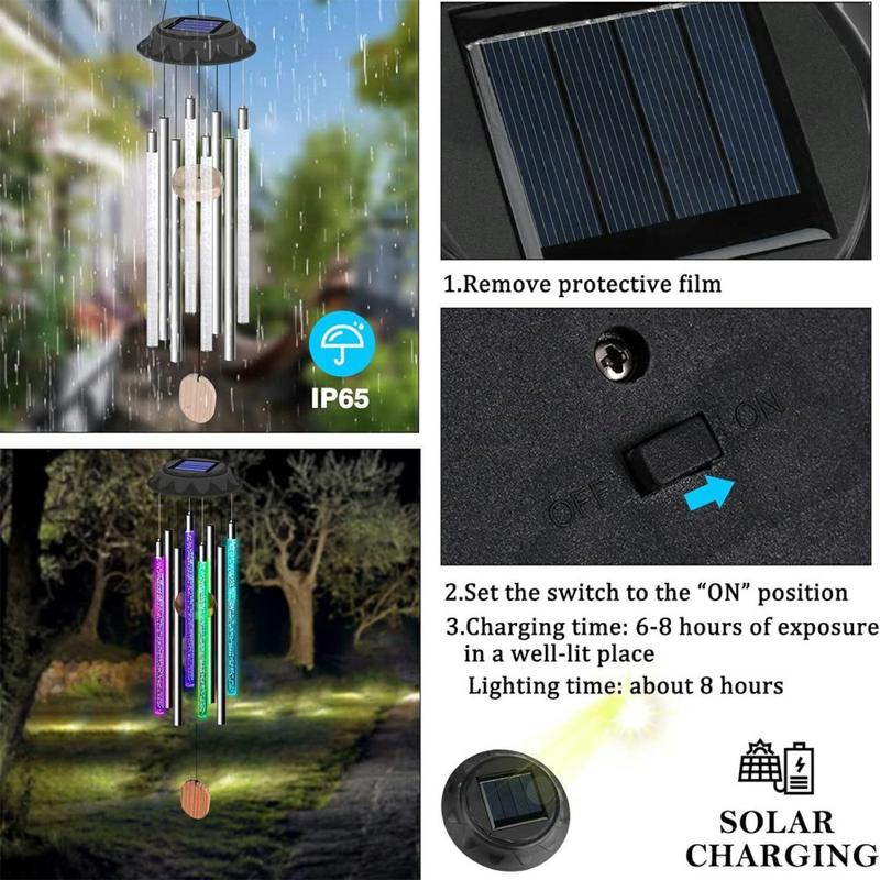 Förvandla uteplatser, balkonger och trädgrenar till en rörlig regnbåge. Detta solcellsdrivna vindspel blandar försiktigt svajande akrylrör med sju färgcyklande lysdioder som bleknar från rött till violett efter skymningen. En 50 × 50 mm monokristallin panel laddar det inbyggda 600 mAh Ni-MH-batteriet på dagen, och lampan tänds automatiskt på natten för upp till 12 timmars fascinerande sken - inga kablar, inga energiräkningar, bara en behaglig atmosfär inomhus eller utomhus.