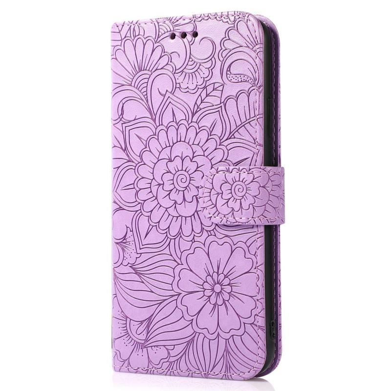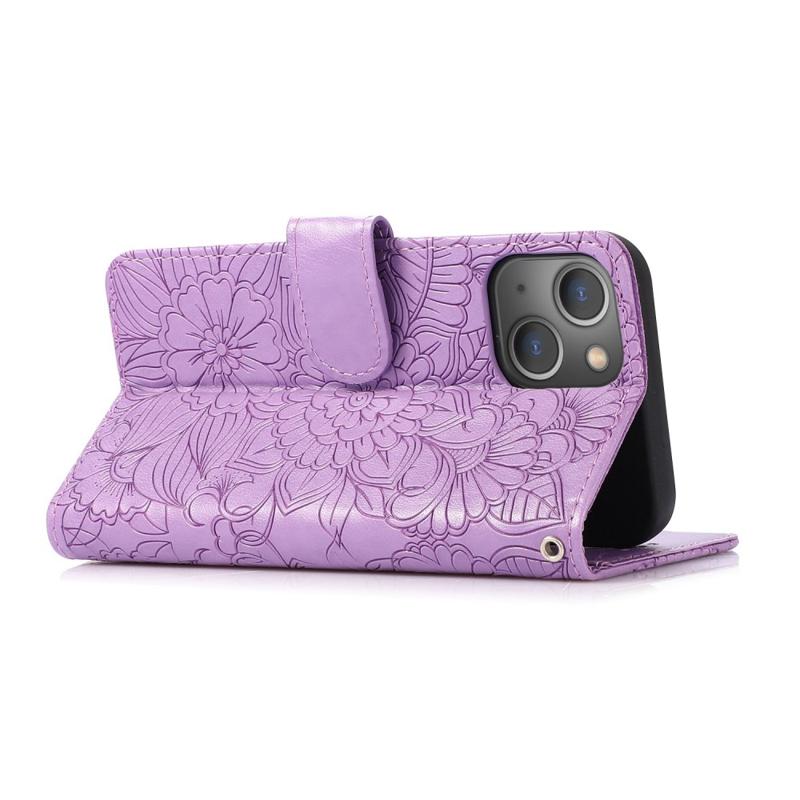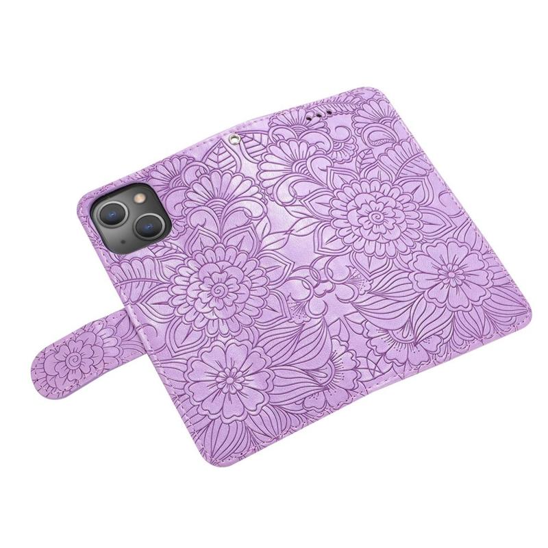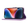 För iPhone 14 tryckt blommönster PU-läder telefonfodral Stativ Stötsäkert plånboksfodral med rem