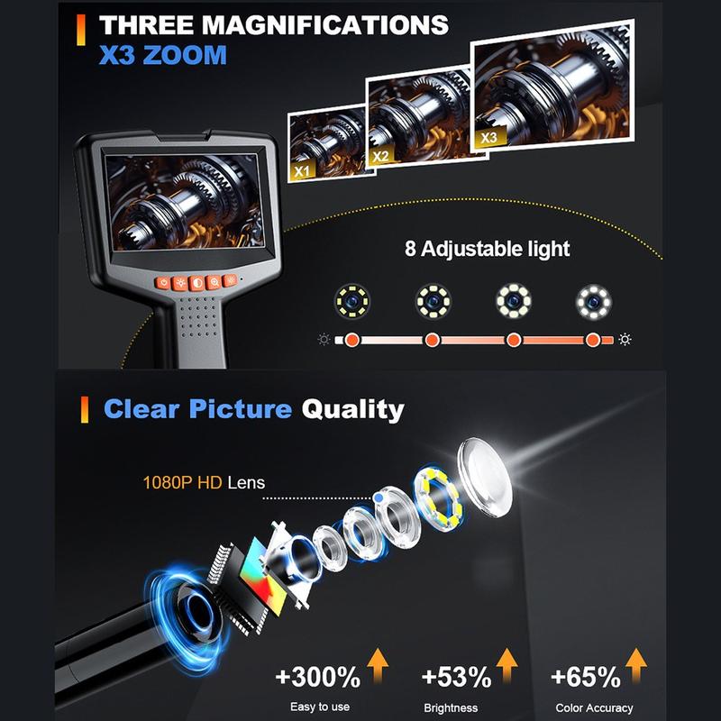 Den flexibla kabeln gör att du enkelt kan inspektera djupa rörledningar, kanaler, maskininteriörer och svåråtkomliga platser - perfekt för både professionella tekniker och gör-det-själv-användare.