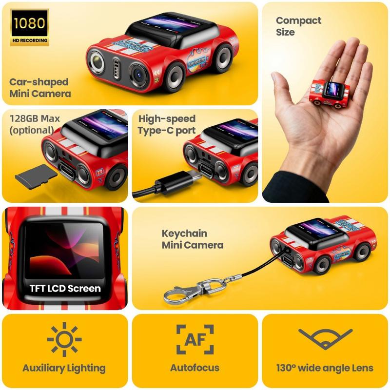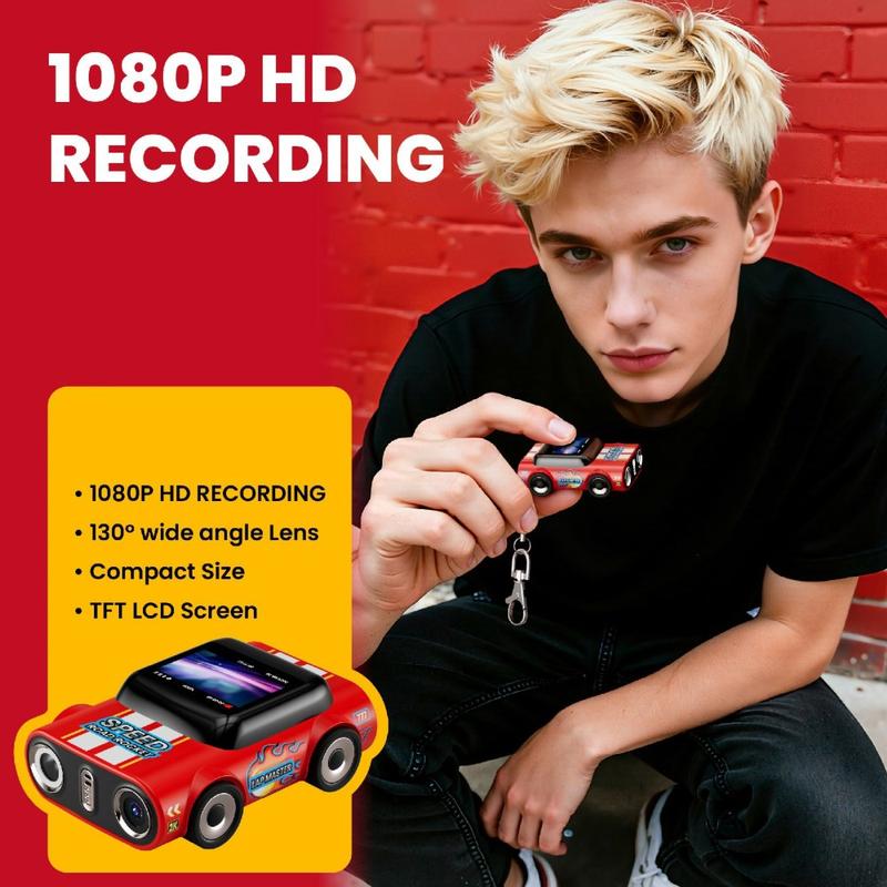 Fånga vardagens ögonblick utan att behöva bära med dig en stor kamera. G5 AUTO mini-tumkamera kombinerar en lekfull bilformad design med äkta 1080p-inspelning, vilket gör den till ett roligt och praktiskt tillbehör för studenter, pendlare och alla som vill kunna snabbt ta fram och spela in film. Fäst den på dina nycklar, ryggsäck eller nyckelband med den medföljande korta kedjan - med en vikt på bara 0,026 kg är den lätt och enkel att ta med sig överallt.