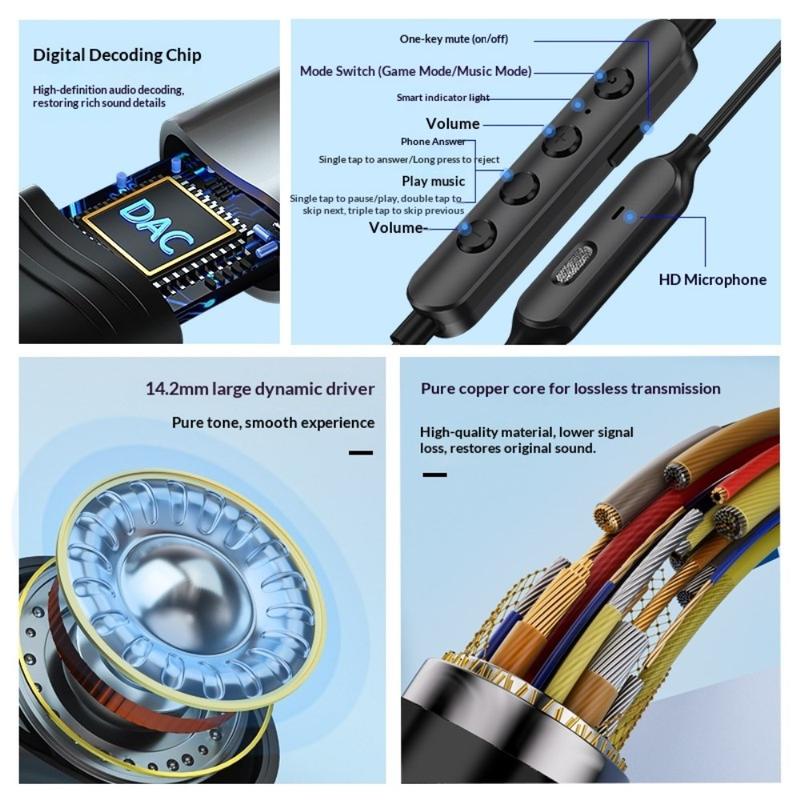 GC0098 Type-C-hörlurar med sladd är utformade för uppslukande spelupplevelser och daglig musiklyssning, och kombinerar kraftfull ljudprestanda med praktiska funktioner för daglig användning. De är utrustade med en stor dynamisk drivelement på 14,2 mm och ett inbyggt digitalt avkodningschip, och levererar klart Hi-Fi-stereoljud med djup bas och detaljerade höga toner. Med dubbla spel- och musiklägen, en stabil Type-C-anslutning och en magnetisk design som förhindrar trassel är dessa hörlurar ett pålitligt val för smartphones, surfplattor och andra Type-C-enheter.