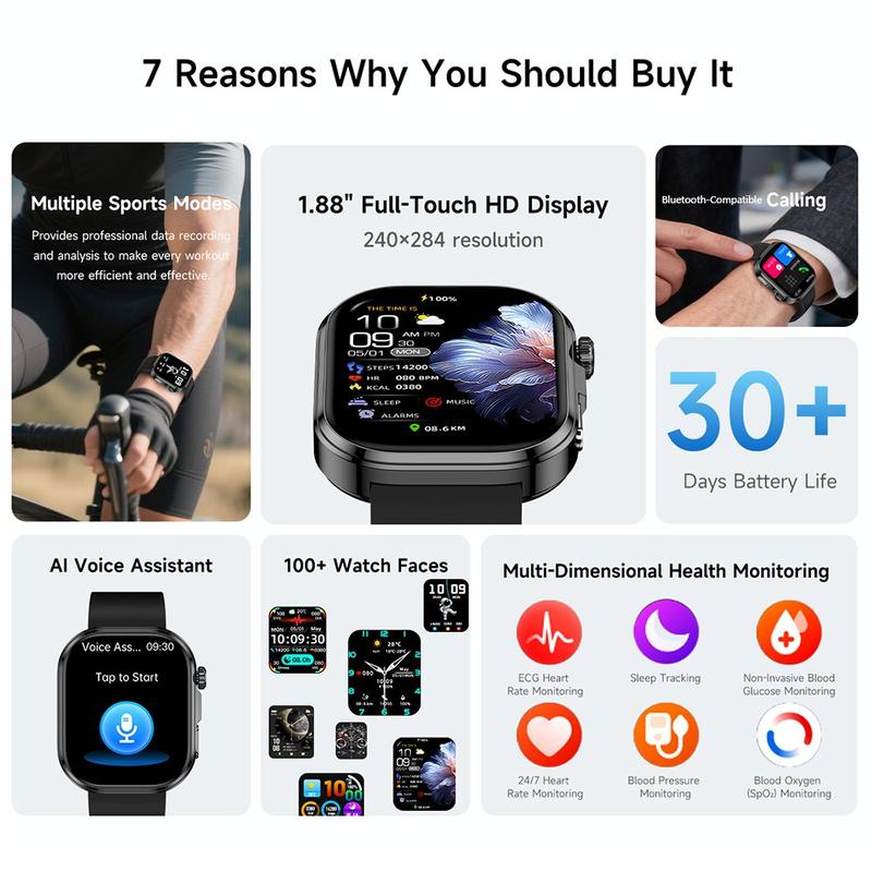 GE52 Smartklocka med 1,88" HD-skärm - EKG-hjärtmonitor, Bluetooth-samtal och fitnessarmband
