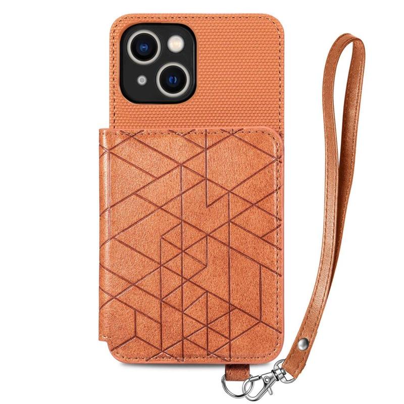 Stativfodral med rem för iPhone 14 Plus, plånbok med geometritryckt bilfäste Metallplåt Läderbelagt TPU-telefonfodral
