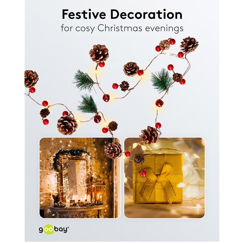 Dessa ljusslingor blandar naturliga dekorativa element med varm LED-belysning för att skapa en tidlös säsongsbetonad look. De äkta kottarna och de festliga bären ger textur och autenticitet, medan timern säkerställer enkel daglig drift. Batteridriften ger dig fullständig frihet när det gäller placering, och silvertråden kan formas för att passa alla inredningsstilar. Med låg energiförbrukning och lång livslängd är detta en hållbar dekorativ belysningslösning som du kan återanvända varje år.