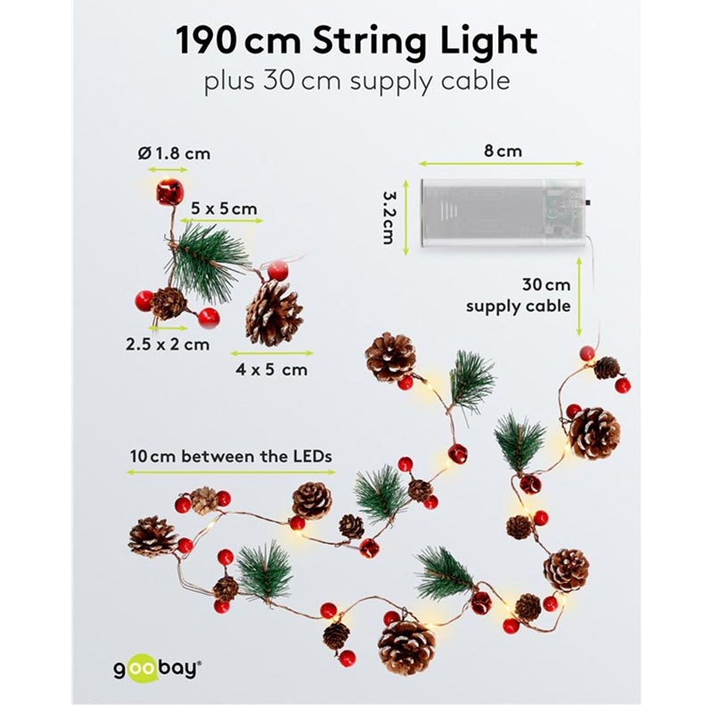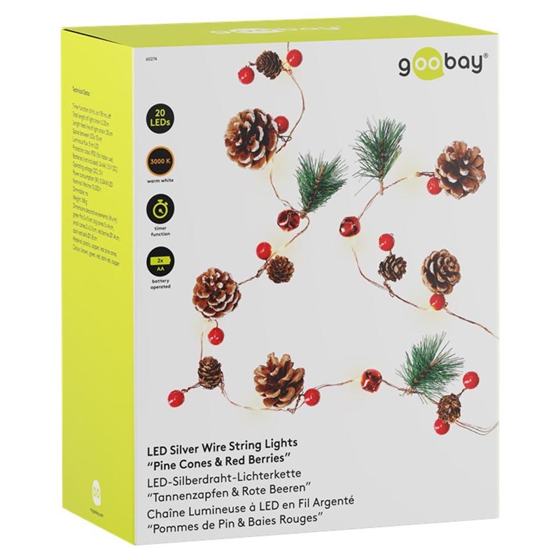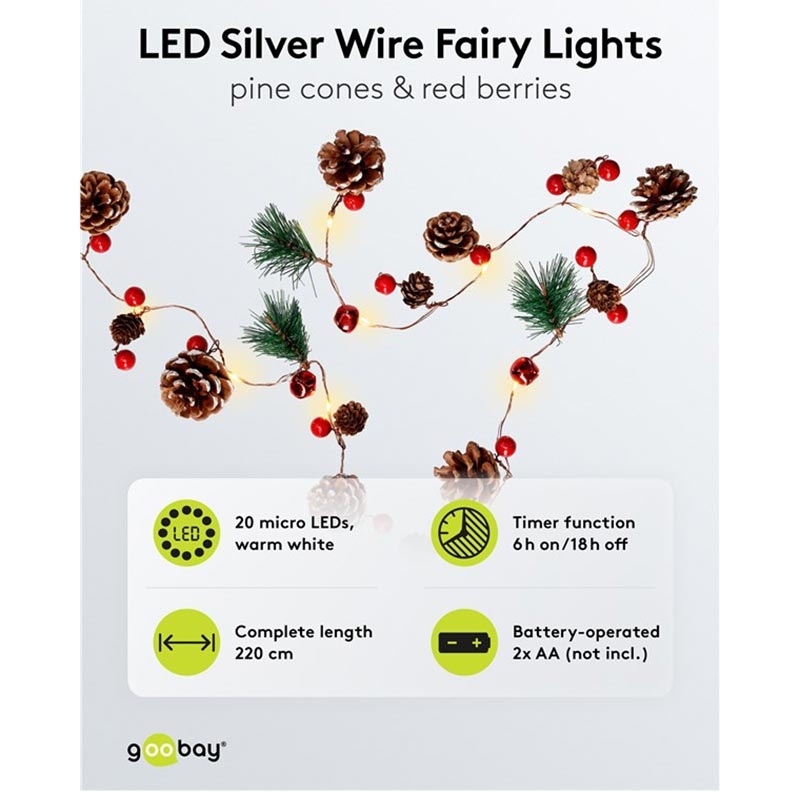 20-LED Ljusslingor i silvertråd "Kottar och röda bär" med timer, varmvit 3000 K, batteridriven (inomhus, IP20)