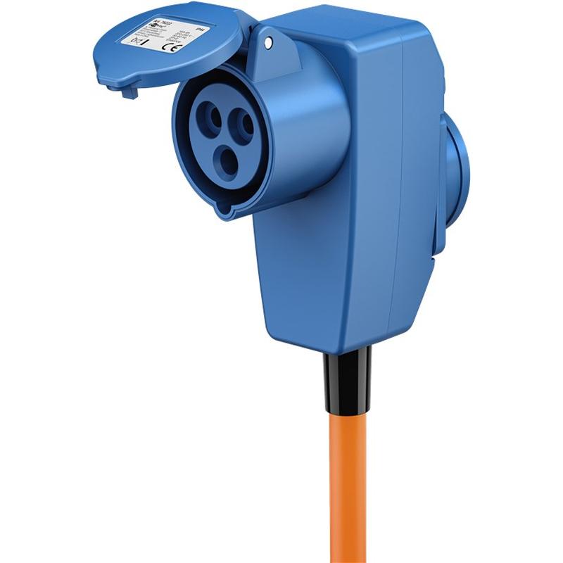 Med sin vinklade CEE-koppling är denna adapterkabel särskilt praktisk där utrymmet är begränsat, t.ex. bakom utrustning, inuti elskåp eller på campingplatser.