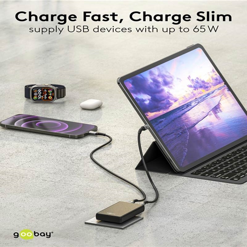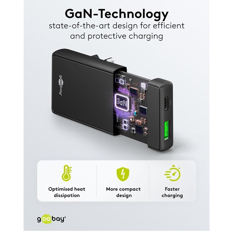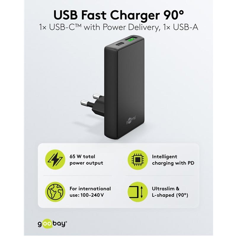Goobay GaN Dubbel snabbladdare 90° Flat 65W - Ultraslank väggladdare med USB-C- och USB-A-portar