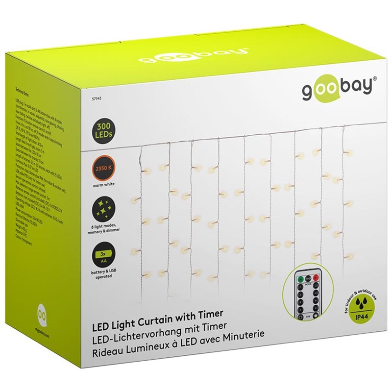 Goobay LED-ljusridå - 300 varmvita lysdioder med fjärrkontroll, timer, dimmer, USB/batteriström (2350 K, IP44)