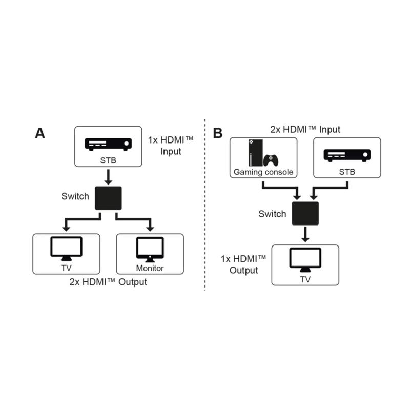 Dubbelriktad HDMI™-switch som dirigerar 1x HDMI™-ingångssignal till 2x HDMI™-enheter, t.ex. bildskärmar, eller alternativt 2x ingångssignaler till 1x terminal. HDMI™-distributör 2 in 1 stöder 3D och upplösningar upp till 4K @ 30 Hz och är HDCP-kompatibel, En knapp väljer antingen utgång1 eller 2 som utgångsdisplay. Bekväm omkoppling på HDMI™-switchen gör att du slipper koppla om kablar och skyddar anslutningarna. Lämplig t.ex. för att ansluta Blu-ray-spelare, SAT/TV-mottagare, datorer, surfplattor, spelkonsoler som PS4 eller Xbox till TV-apparater, monitorer eller projektorer, HDMI™ switchbox 2x1 fungerar direkt via den anslutna HDMI™-enheten utan extern strömförsörjning. Observera: HDMI™-switchen är inte en splitter!