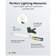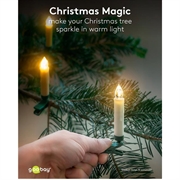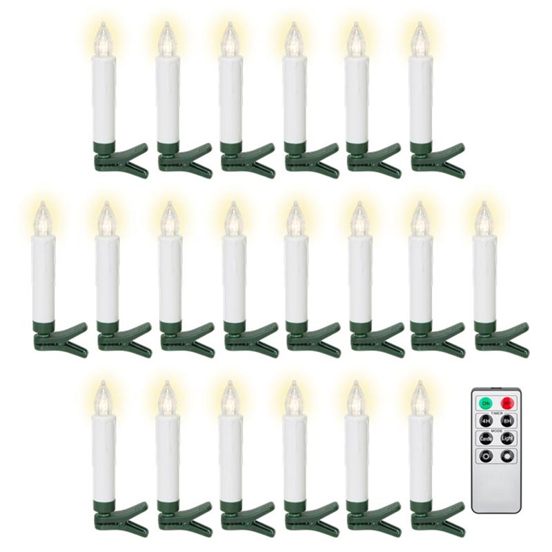 Upplev skönheten i klassiska julljus - utan rök, lågor eller droppande vax. Denna uppsättning med 20 trådlösa LED-julgransljus ger ett varmvitt sken på 2600 K med en realistisk vaxliknande finish. Den sladdlösa designen håller din gran snygg och elegant, medan de medföljande klämmorna möjliggör exakt ljusplacering. Med fjärrkontrollen kan du justera ljusstyrkan, välja mellan olika flammlägen och aktivera timerinställningar för enkel festbelysning. En perfekt kombination av traditionell charm och modern bekvämlighet, som ger en säker och långvarig stämning under hela julsäsongen.