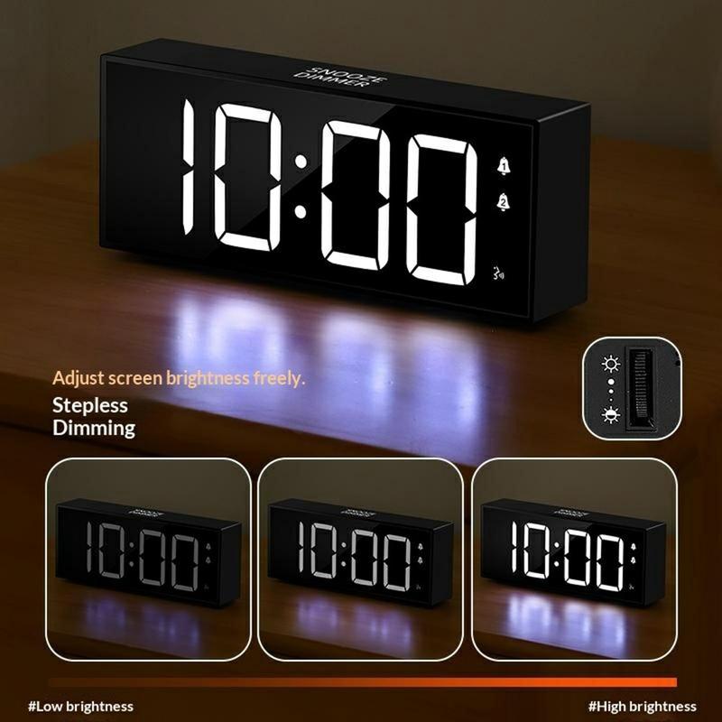 GS-8813 LED digital väckarklocka är en modern säng- och skrivbordsur som är utformad för tydlig synlighet, flexibla alarm och ett rent, elegant utseende. Den stora LED-displayen med ultratunna ramar är läsbar från andra sidan rummet, medan inbyggd temperaturövervakning och RGB-belysning ger extra värde i vardagen. Med dubbla alarm, röstaktiverad energisparfunktion, snooze och minnesbackup är den ett praktiskt val för sovrum, vardagsrum och arbetsutrymmen.
