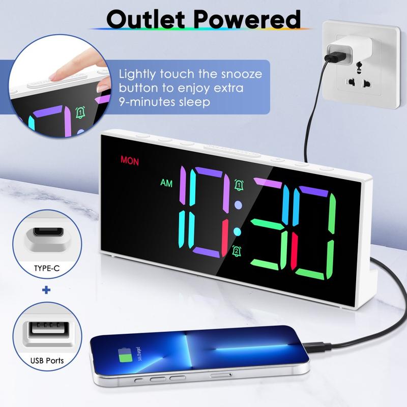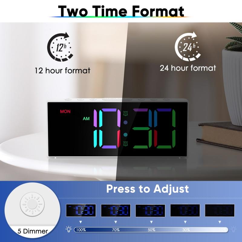 GS-G11 RGB Digital Alarm Clock är en modern bordsklocka avsedd för sovrum, vardagsrum och skrivbord där tydlig synlighet och enkel kontroll är viktigt. Den livfulla LED-displayen erbjuder flera RGB-färglägen, medan justerbar ljusstyrka och volym gör att du kan anpassa klockan efter ditt rum och dina rutiner. Med dubbla alarm, en praktisk snooze-funktion och minnesbackup för strömavbrott är det en praktisk vardagsklocka som också ger ditt rum en stilfull glans.