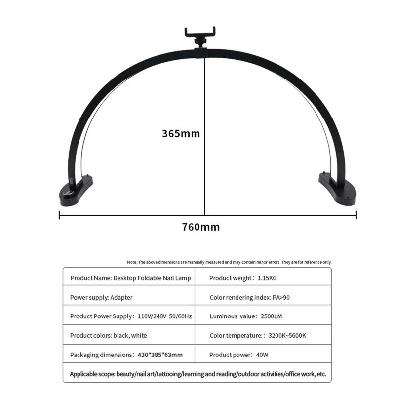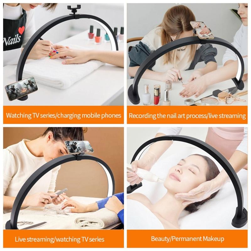 Skapa ett rent och smickrande ljus för precisionsarbete med HD-M11X 28-tums U-formad skuggfri LED-fyllningslampa. Dess halvcirkelformade design bidrar till att minska hårda skuggor, vilket gör den idealisk för skönhetsbehandlingar, nagelkonst, tatueringsarbete, innehållsskapande och detaljerade skrivbordsuppgifter. Med 280 LED-lampor med dubbla färger kan du växla mellan varma och kalla toner och finjustera stämningen från 3200K till 5600K. En hög CRI >90 gör att färgerna ser naturliga och korrekta ut - särskilt användbart när du matchar makeuptoner, väljer nagelfärger eller arbetar med hudtoner. Lampan ger upp till 2 500 lm ljusstyrka vid 40 W och inkluderar skrivbordsfästen samt en telefonhållare för en prydlig arbetsstation.