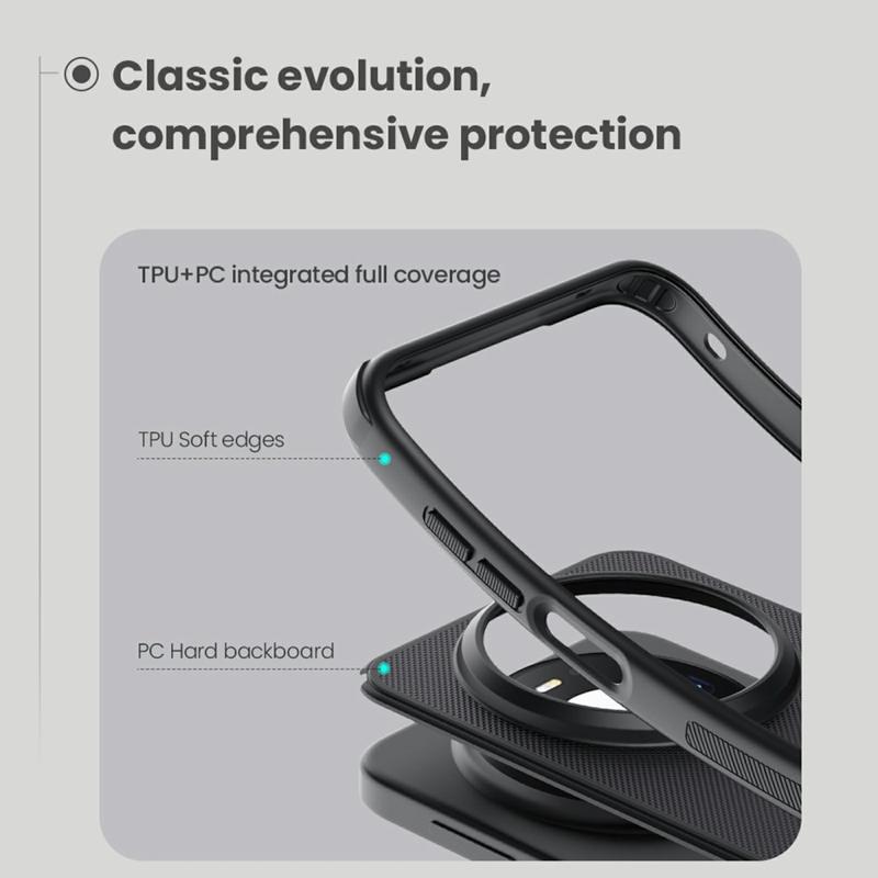 Nillkin Frosted Shield Pro Magnetic hybridskal ger en bekväm känsla i handen och ett starkt skydd mot dagliga skador och slitage. Det håller din Huawei Mate 80 Pro Max välskyddad tack vare sin kombination av miljövänligt polykarbonat och flexibelt TPU. Nillkin Frosted Shield Pro Magnetic hybridfodral innehåller även en inbyggd magnetisk ring som är kompatibel med trådlös laddning, vilket innebär att du kan ladda din Huawei Mate 80 Pro Max från och med nu med skalet på.