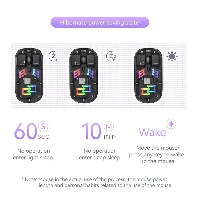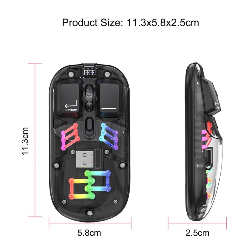 HXSJ T200 Wireless Bluetooth Mouse erbjuder dubbla anslutningsmöjligheter via Bluetooth och 2,4 GHz trådlöst, vilket stöder samtidiga anslutningar till två enheter. Musen är tillverkad av transparent PC-material med anpassningsbar RGB-belysning och ger ett avancerat utseende och överlägsen funktionalitet. Med justerbar DPI (800/1200/1600), ett uppladdningsbart 400mAh-batteri med lång livslängd och en snygg ergonomisk design garanterar den exakt och smidig användning. Musen är idealisk för både arbete och spel och förbättrar effektiviteten och komforten med tysta klick och levande belysning.