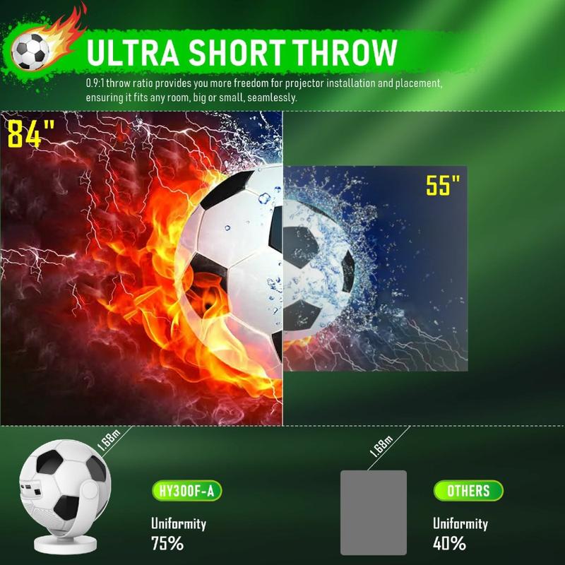 Ta med storbildsunderhållning till mindre utrymmen med den bärbara projektorn HY300F i fotbollsform. Denna kompakta smarta projektor har en distinkt design inspirerad av fotboll och kombinerar en lekfull stil med praktiska funktioner för hemunderhållning. Oavsett om du vill streama filmer, titta på direktsänd sport, njuta av serier eller projicera innehåll på sovrumsväggen eller i taket, erbjuder den här modellen ett enkelt och flexibelt sätt att skapa en mer uppslukande tittarupplevelse hemma.