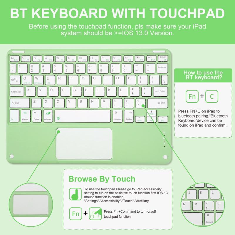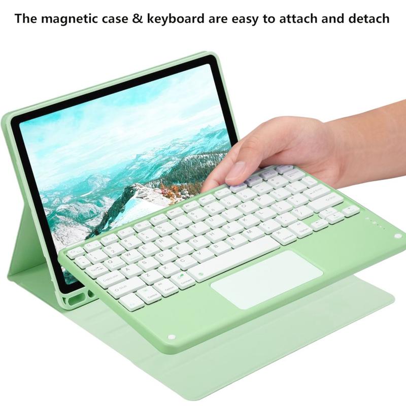 Förbättra din iPad Air 11 2026/2025/2024, iPad Air 2022/2020 med Bluetooth tangentbordsfodralet, ett multifunktionellt 2-i-1-tillbehör som kombinerar skydd, produktivitet och stil. Detta eleganta fodral är tillverkat av premiumpolyretan och ger fullt skydd mot repor, stötar och fingeravtryck samtidigt som det ger ett professionellt utseende. Bluetooth-tangentbordet ansluts trådlöst för smidig, responsiv skrivning, medan den integrerade pekplattan stöder multigeststyrning för enkel navigering. Med ett bakgrundsbelyst tangentbord kan du skriva bekvämt även i miljöer med svagt ljus. Det inbyggda justerbara stativet ger en ergonomisk betraktningsvinkel, vilket gör den perfekt för att skriva, streama eller läsa. Detta tangentbordsfodral är utformat för företag, resor eller vardagsbruk och förvandlar din surfplatta till en bärbar arbetsstation.