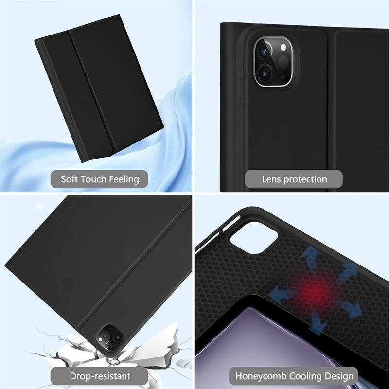 Förbättra din iPad Air 13 2026/2025/2024, iPad Pro 12.9 2022/2021/2020/2018 med Bluetooth tangentbordsfodralet, ett multifunktionellt 2-i-1-tillbehör som kombinerar skydd, produktivitet och stil. Detta eleganta fodral är tillverkat av premiumpolyretan och ger fullt skydd mot repor, stötar och fingeravtryck samtidigt som det ger ett professionellt utseende. Bluetooth-tangentbordet ansluts trådlöst för smidig, responsiv skrivning, medan den integrerade pekplattan stöder multigeststyrning för enkel navigering. Med ett bakgrundsbelyst tangentbord kan du skriva bekvämt även i miljöer med svagt ljus. Det inbyggda justerbara stativet ger en ergonomisk betraktningsvinkel, vilket gör den perfekt för att skriva, streama eller läsa. Detta tangentbordsfodral är utformat för företag, resor eller vardagsbruk och förvandlar din surfplatta till en bärbar arbetsstation.