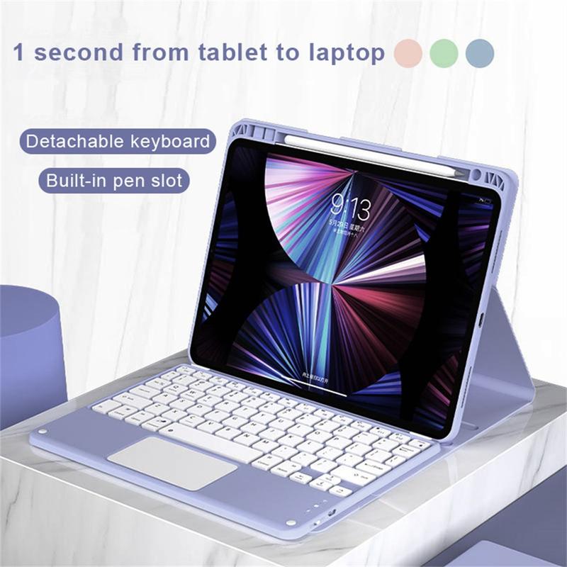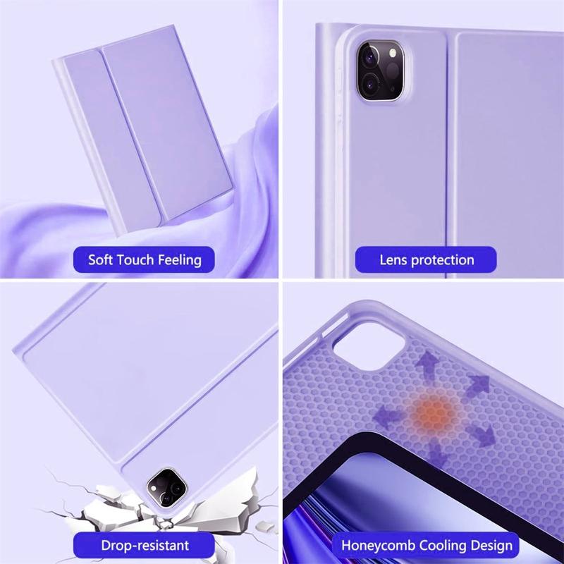 Förbättra din iPad Air 13 2026/2025/2024, iPad Pro 12.9 2022/2021/2020/2018 med Bluetooth tangentbordsfodralet, ett multifunktionellt 2-i-1-tillbehör som kombinerar skydd, produktivitet och stil. Detta eleganta fodral är tillverkat av premiumpolyretan och ger fullt skydd mot repor, stötar och fingeravtryck samtidigt som det ger ett professionellt utseende. Bluetooth-tangentbordet ansluts trådlöst för smidig, responsiv skrivning, medan den integrerade pekplattan stöder multigeststyrning för enkel navigering. Med ett bakgrundsbelyst tangentbord kan du skriva bekvämt även i miljöer med svagt ljus. Det inbyggda justerbara stativet ger en ergonomisk betraktningsvinkel, vilket gör den perfekt för att skriva, streama eller läsa. Detta tangentbordsfodral är utformat för företag, resor eller vardagsbruk och förvandlar din surfplatta till en bärbar arbetsstation.