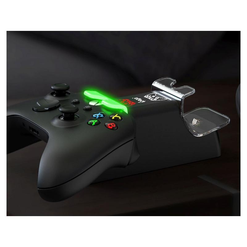 iPega XBS003 dubbel laddare för X-Box Series S-kontroller med två batterier för en original gamepad. Tack vare denna laddningsstation kommer det aldrig att hända att din handkontroll får slut på ström och du måste vänta eller spela med en laddningskabel i handkontrollen. Laddaren kan ladda två gamepads samtidigt och med LED-indikering kan du enkelt se om laddningen är klar. Du kommer också att lösa problemet med var du ska placera kontrollerna efter att du har spelat. Laddaren är också mycket väldesignad och kommer att passa på din spelplats. De två medföljande batterierna har en kapacitet på 800 mAh och laddningskabeln är diskret gömd under laddningsbasen.