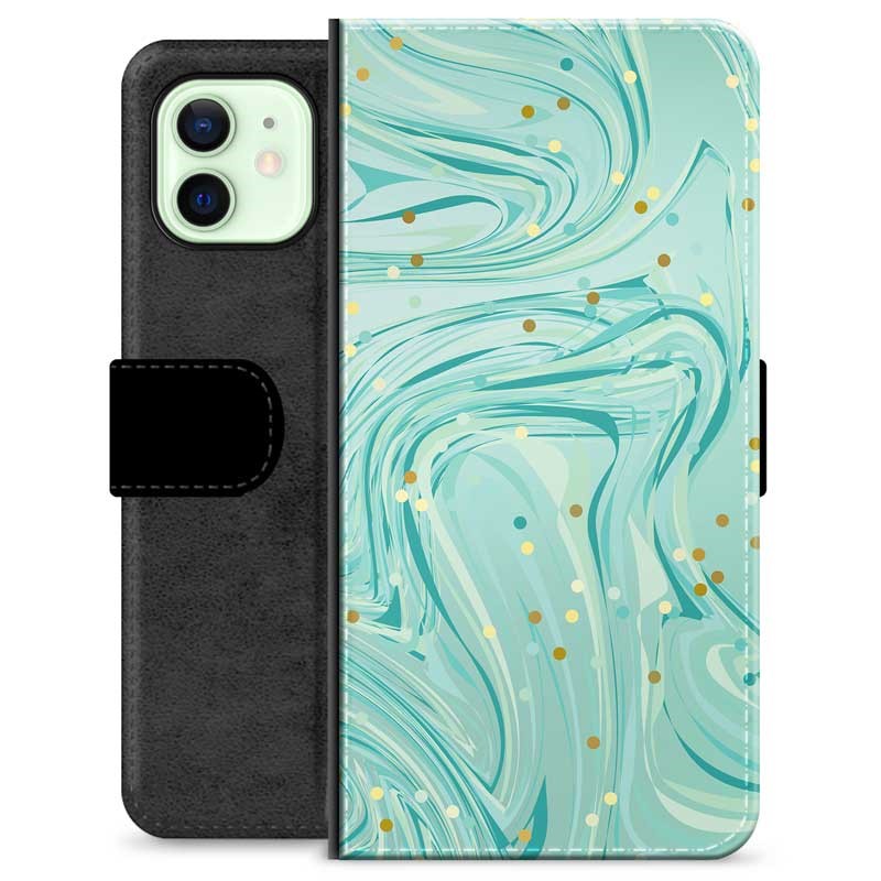 Det här är ett premium plånboksfodral för iPhone 12 i en iögonfallande grönmint färg. Fodralet erbjuder inte bara ett stilfullt utseende med sitt unika mönster av virvlande gröna och gyllene punkter, utan ger även ett utmärkt skydd för din smartphone.