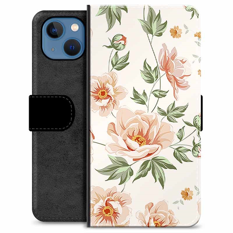 Detta är ett premium plånboksfodral designat specifikt för iPhone 13 som kombinerar stil och funktionalitet. Fodralet har en blommig design med ett elegant mönster av pastellfärgade blommor och gröna blad mot en ljus bakgrund, vilket ger ett fräscht och modernt utseende. Fodralet är tillverkat av högkvalitativt material som inte bara ser bra ut utan även skyddar din telefon från repor, stötar och smuts.