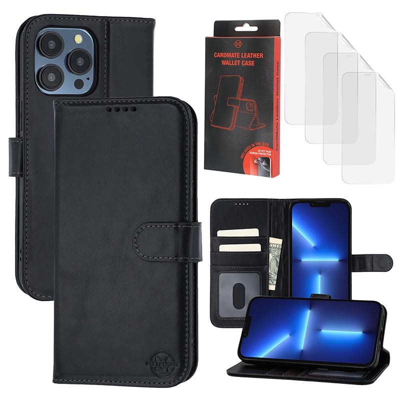 MyTPhone CardMate Premium läder plånboksfodral för iPhone 13 Pro Max, iPhone 12 Pro Max - Stativ funktion, korthållare, stöd för trådlös laddning, 2x skärmskydd
