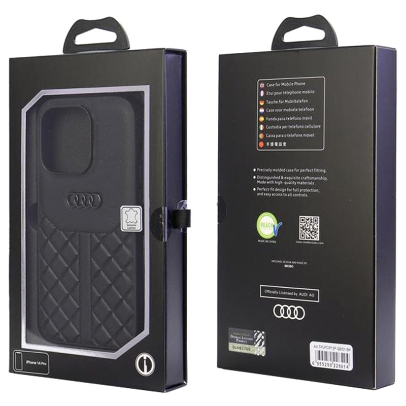 Audis elegans och premiumkvalitet gör detta läderbelagda fodral perfekt för din iPhone 13, iPhone 13 Pro. Detta eleganta fodral är tillverkat av flexibelt TPU-material, belagt med det finaste äkta lädret som är präglat med geometriska mönster och Audi-logotypen. På det sättet får din iPhone 13, iPhone 13 Pro en lyxig design, pålitligt skydd och säkert grepp.
