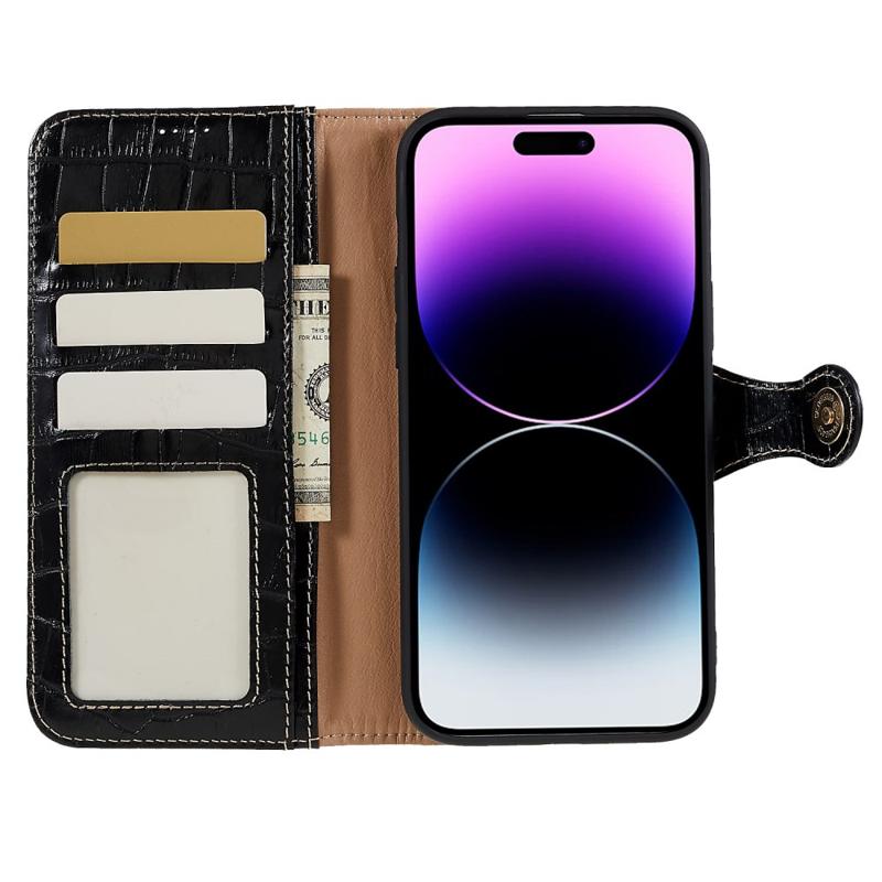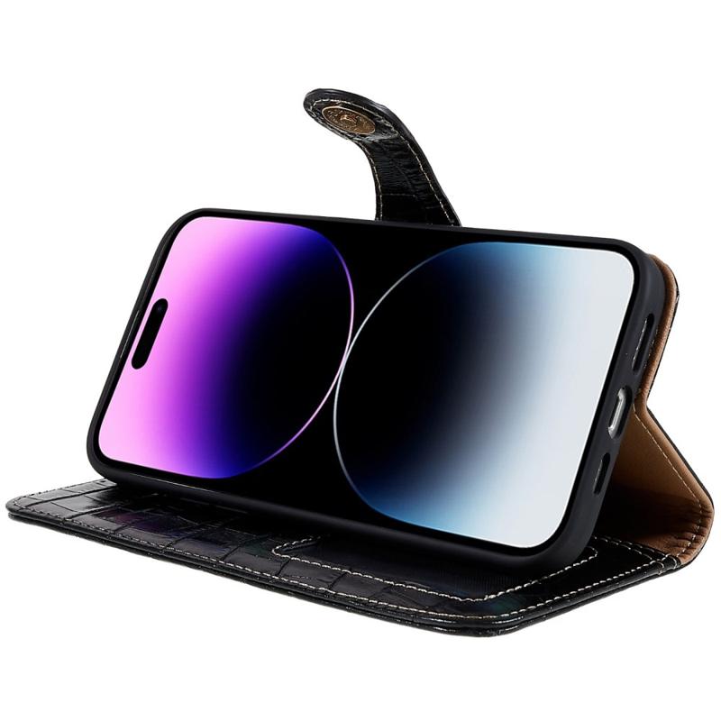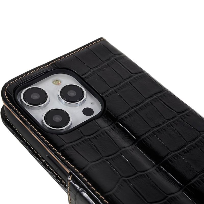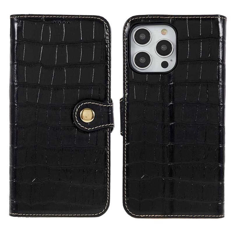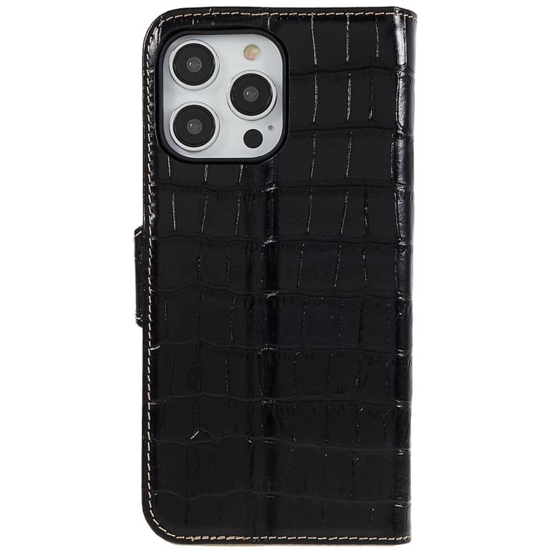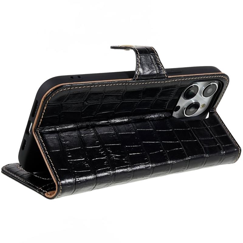 För iPhone 14 Pro Max Telefonfodral i äkta kohudsläder Crocodile Texture Stand Flip Wallet Cover