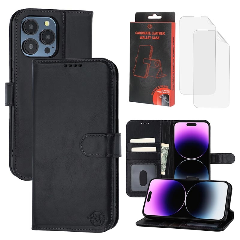 • MyTPhone CardMate Premium läder plånboksfodral för iPhone 14 Pro - Stativ funktion, korthållare, stöd för trådlös laddning, 2x skärmskydd