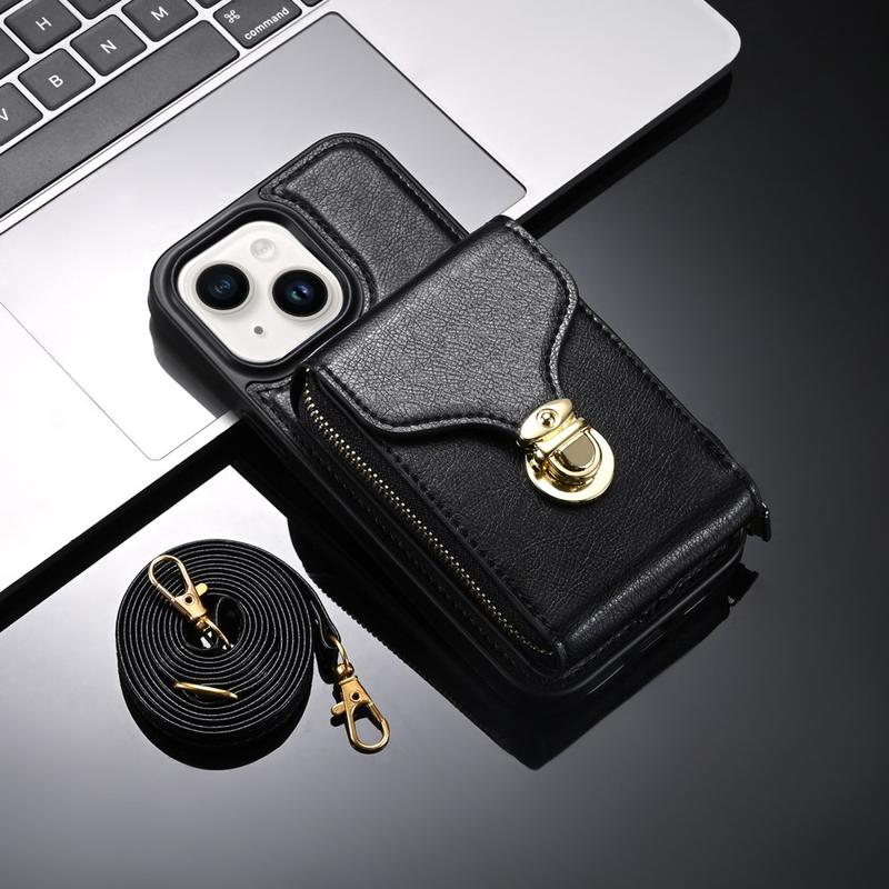 Allt-i-ett skyddande TPU-skal med plånbok och rem för iPhone 15