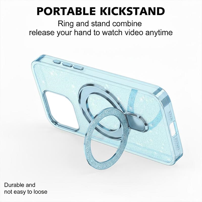 - Glitterdesign - Har en glittrande glitterfinish på både fodralet och ringkickstödet, vilket ger din telefon ett unikt, iögonfallande utseende.