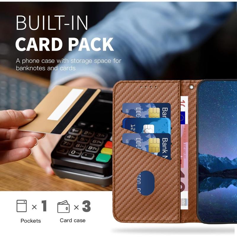 Detta plånboksfodral erbjuder elegant design, tillförlitligt skydd och smart användbarhet. Den texturerade kolfiberfinishen ger ett modernt, professionellt utseende, medan det inre TPU-skiktet absorberar stötar från oavsiktliga fall. Med handsfree-funktionalitet och en avtagbar rem är det byggt för komfort och mångsidighet.