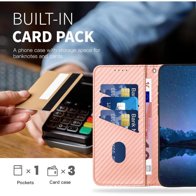 Detta plånboksfodral erbjuder elegant design, tillförlitligt skydd och smart användbarhet. Den texturerade kolfiberfinishen ger ett modernt, professionellt utseende, medan det inre TPU-skiktet absorberar stötar från oavsiktliga fall. Med handsfree-funktionalitet och en avtagbar rem är det byggt för komfort och mångsidighet.