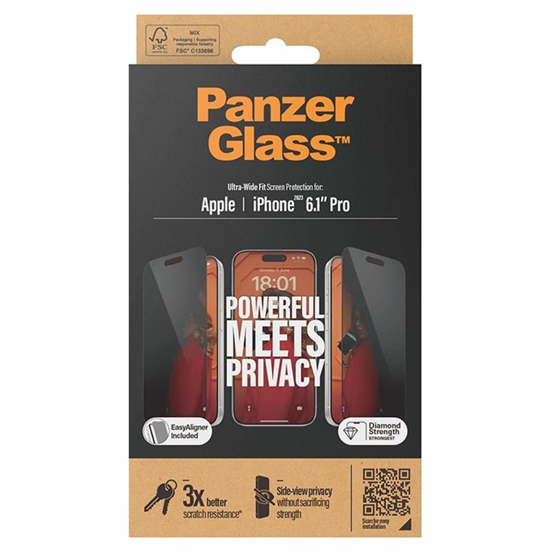 Säg adjö till nyfikna ögon och hej till sinnesfrid - PanzerGlass Ultra-Wide Fit Privacy härdat glas med EasyAligner för iPhone 15 Pro kommer att hålla dina privata meddelanden eller bankuppgifter säkra. Det ger också ett oslagbart skydd mot repor, oavsiktliga stötar och fläckar, tack vare dess härdat glas på diamantnivå utvecklat av PanzerGlass.