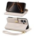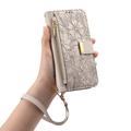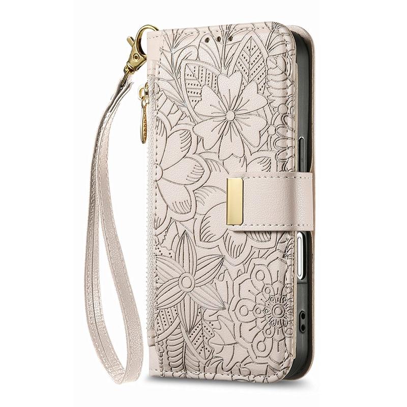 Plånboksfodral i mönster av blommor och blad med blixtlåsficka och handledsrem för iPhone 16