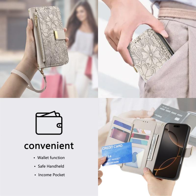 Till skillnad från vanliga iPhone 16-fodral kombinerar detta allt-i-ett plånboksfodral skydd, organisation och elegans. Det blommiga trycket ger det en elegant kant, medan blixtlåsfickan och handledsremmen ger oöverträffad bekvämlighet för det dagliga livet och resor.