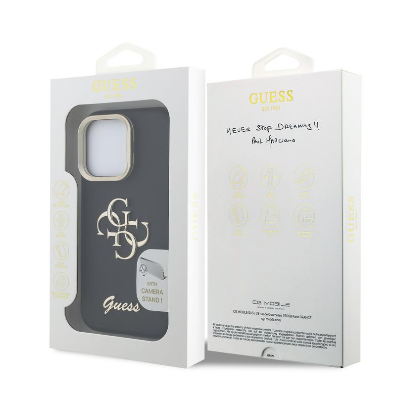 Guess Grained 4G Logo Stativkameraramskal för iPhone 16 Pro Max - Designerstil med enkel handsfree