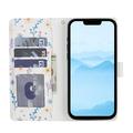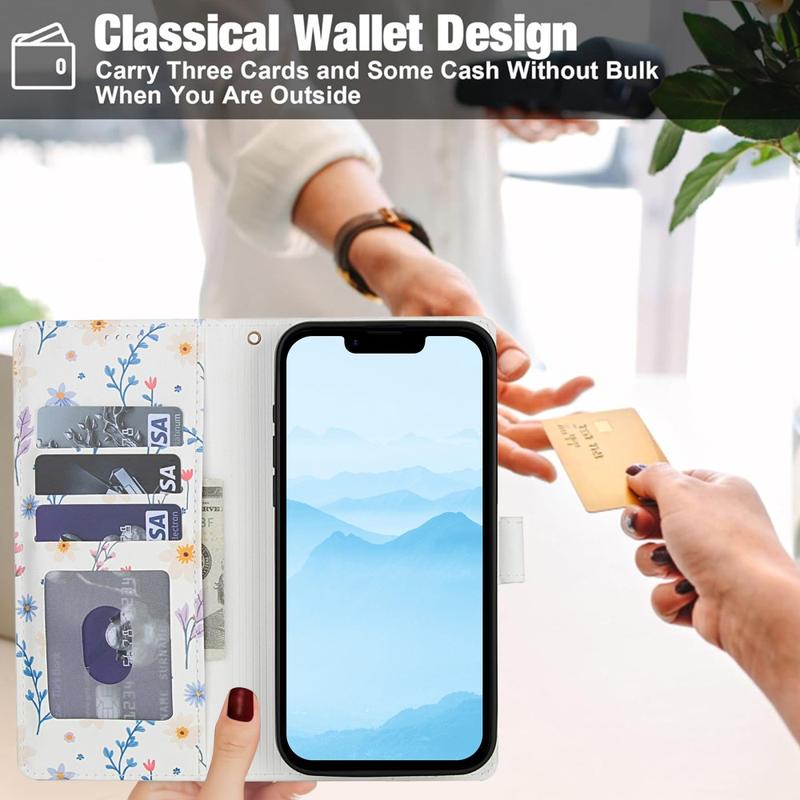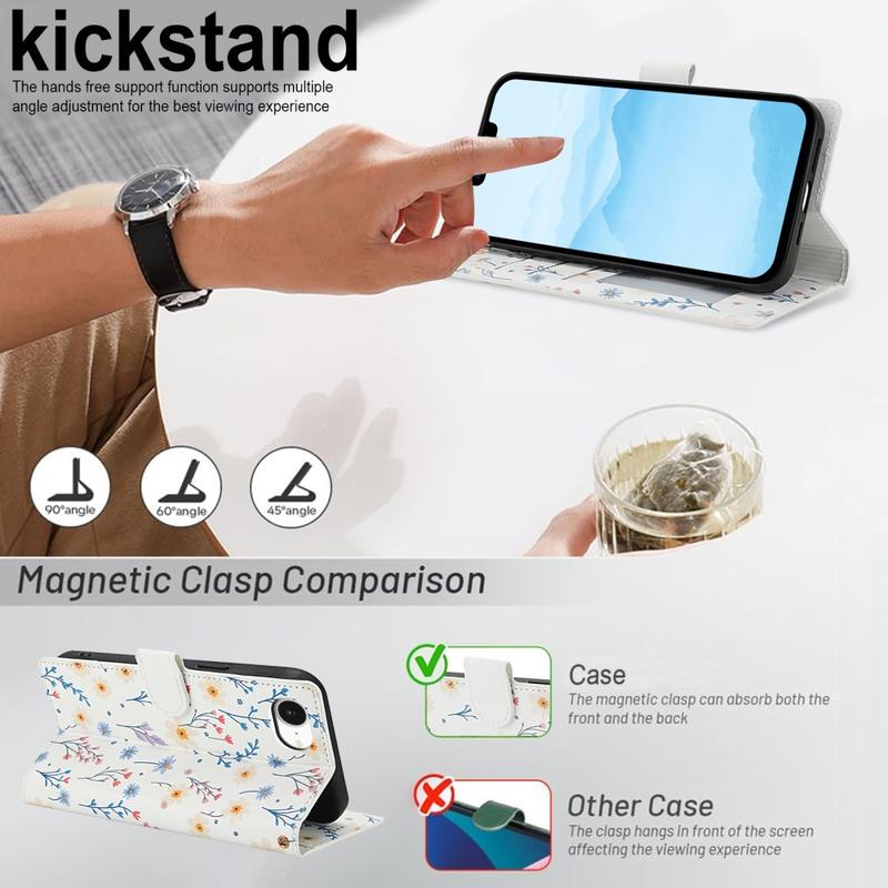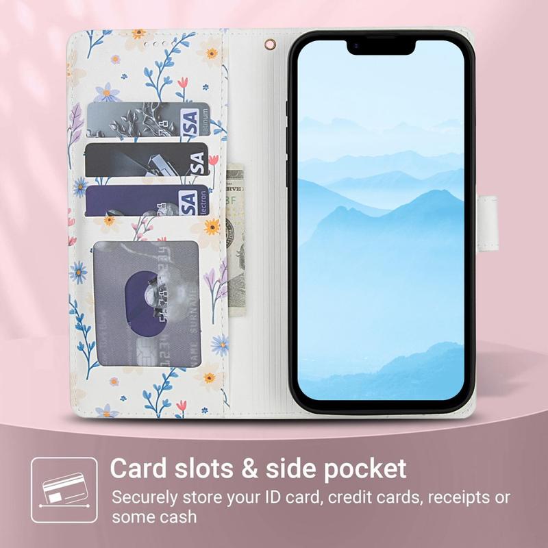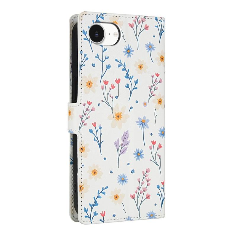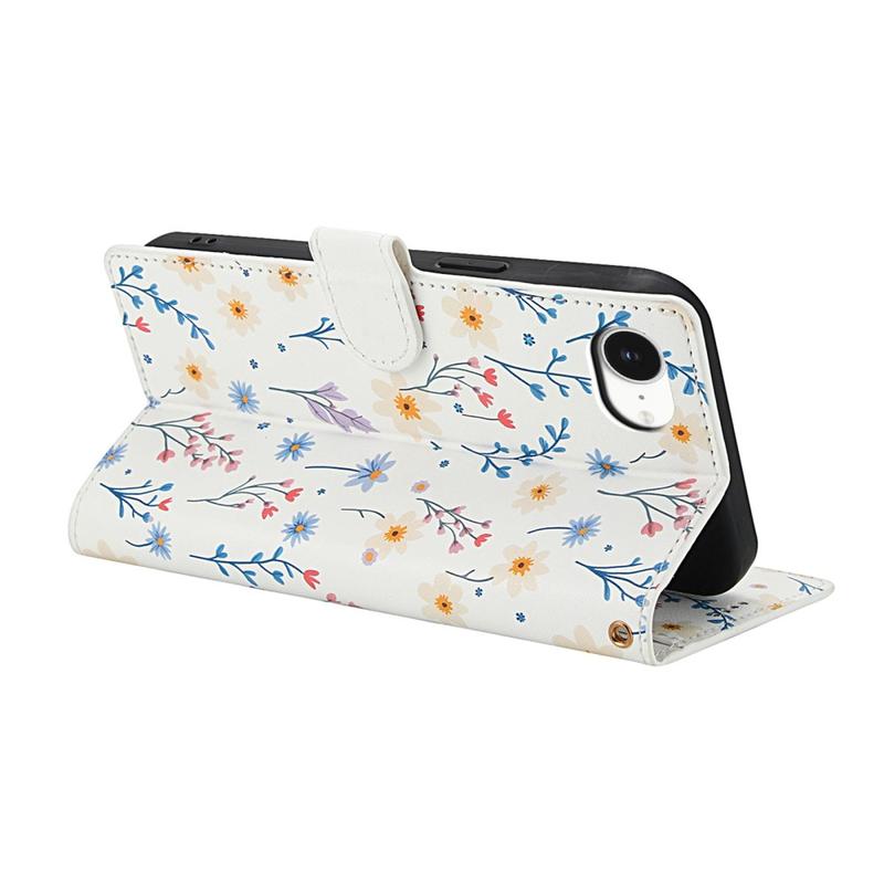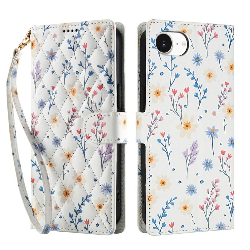 Rombiskt blommigt plånboksfodral för iPhone 16e - med rem och kortfack