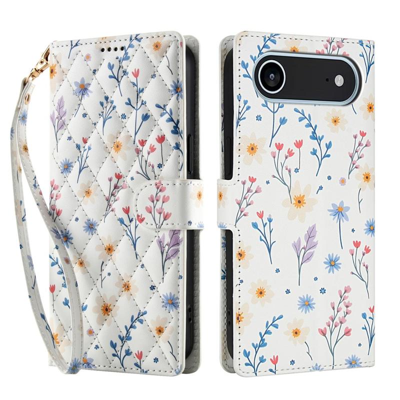 Uppdatera din iPhone Air med en tunn flip-plånbok som kombinerar säkert skydd och praktisk användning i vardagen. Den rombiskt sydda fronten och det småblommiga mönstret ger en elegant stil, medan ett mjukt TPU-skal dämpar fall och ett polyuretanomslag skyddar mot repor. Flera kortplatser, en kontantficka och en medföljande handledsrem gör det här fodralet till den perfekta lösningen för pendling, resor eller utekvällar.