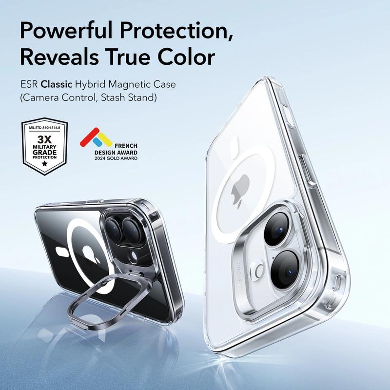 ESR Classic Hybrid Kickstand Case för iPhone 17 kombinerar slimmad elegans med kraftfullt skydd. Dess transparenta hårda baksida visar upp din iPhone 17:s originaldesign medan förstärkta TPU-hörn ger extra hållbarhet mot fall och stötar.
